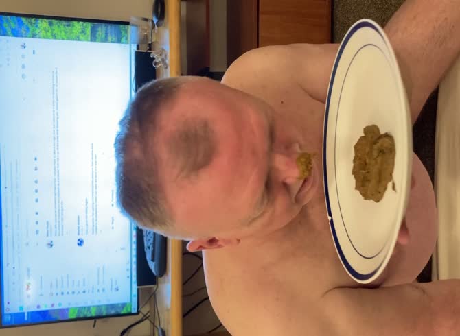Shits on a plate, sticks his nose in it, face-dives the fresh steaming shitpile, then laps up a bite with his tongue and swallows. In Extrem Sex Channels: Scat.